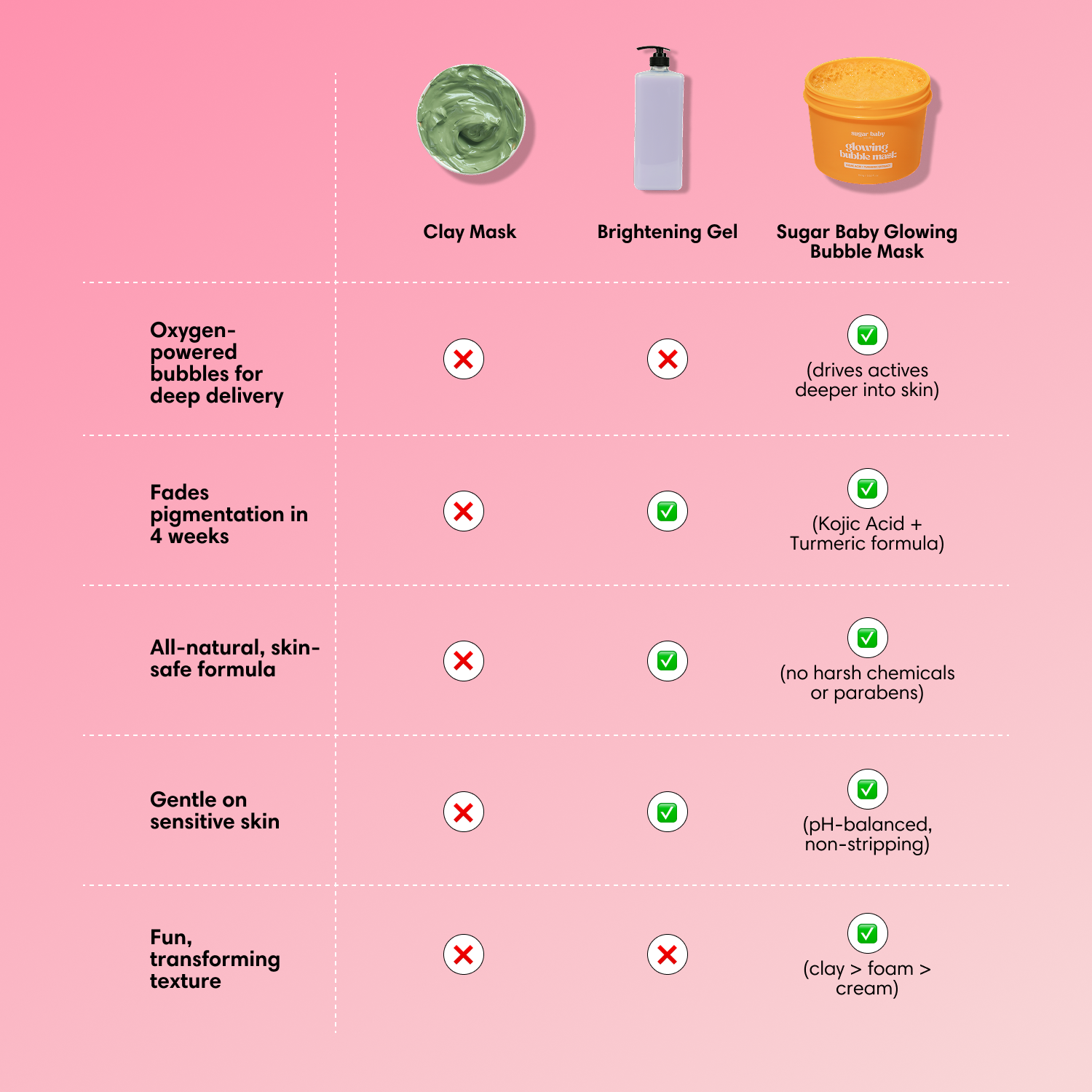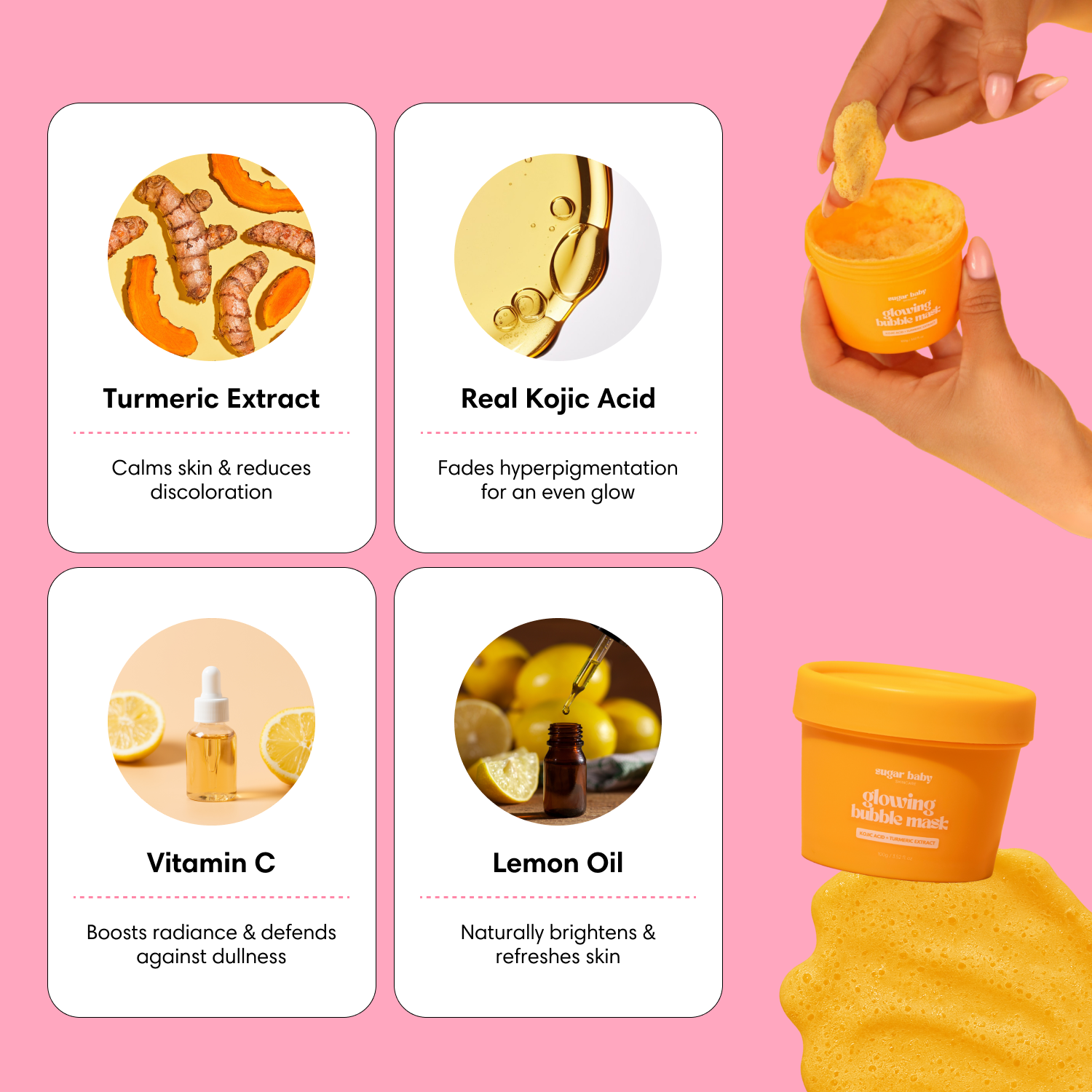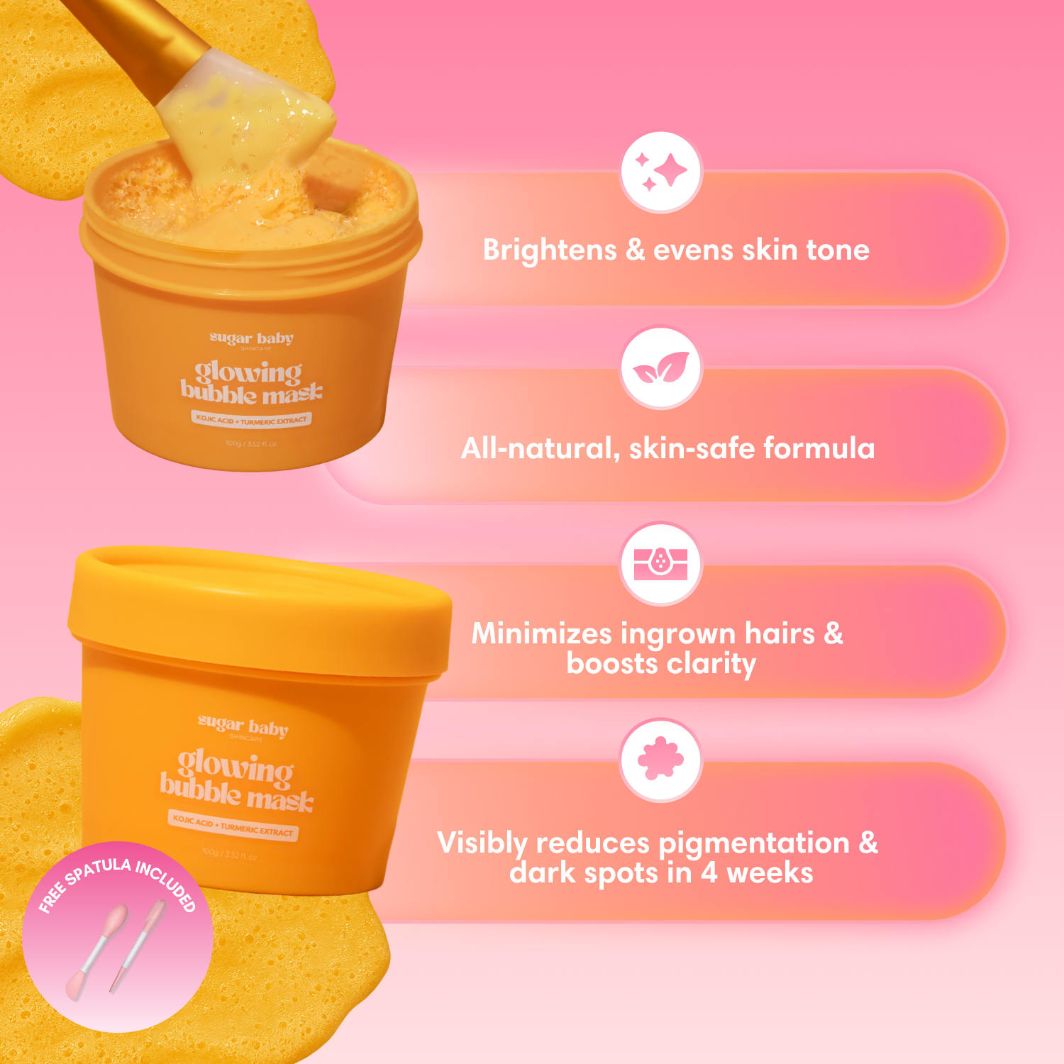 The Glowing Bubble Mask is a brightening oxygen clay-to-cream treatment that fizzes on contact, delivering active ingredients deep into your skin for a visible glow. Powered by Kojic Acid, Turmeric Extract, and Vitamin C, it targets dark spots, evens tone, and smooths texture without irritation. The oxygen bubbles gently exfoliate, then melt into a silky cream that hydrates and leaves skin soft, radiant, and refreshed.