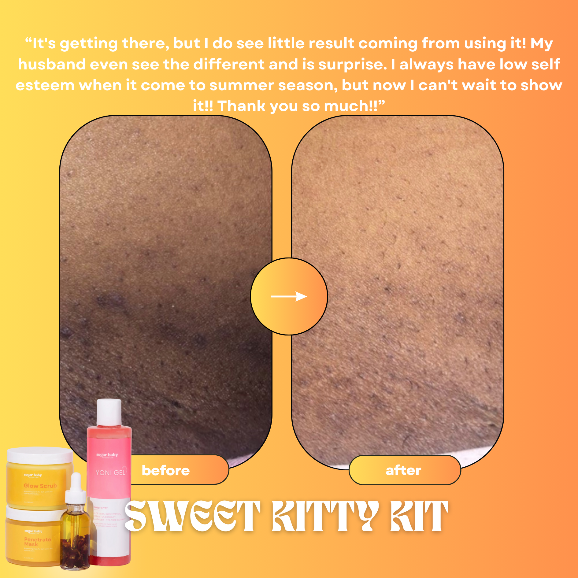 Our Sweet Kitty Kit is formulated with love and has the answer to all your feminine care needs. Say goodbye to dark spots and unwanted odor and embrace the confidence that comes with a fresh, rejuvenated intimate area. This all-inclusive kit features the transformative power of our Glow Scrub, Penetrate Mask, Yoni Gel, and luxurious Rose Oil. Experience the ultimate in feminine care and unlock a world of radiance and bliss.